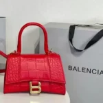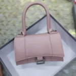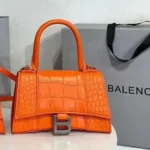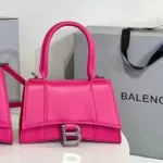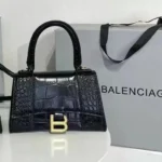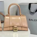 The Balenciaga Hourglass XS Handbag, introduced in the 2010s, is a testament to the brand’s fusion of historical inspiration and modern design. Drawing from Cristóbal Balenciaga’s 1950s Basque waistcoats, the bag features a distinctive curved silhouette that mirrors the hourglass shape. This compact version retains the iconic B logo hardware, a structured top handle, and a detachable shoulder strap, offering versatility for various occasions. Crafted from premium materials like calf leather, the Hourglass XS is available in a range of finishes, including croc-embossed textures and glitter embellishments, catering to diverse style preferences.