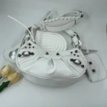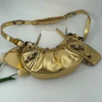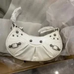 The Balenciaga Le Cagole XS Shoulder Bag captures the essence of early 2000s fashion with its moto-inspired design and edgy embellishments. Crafted in Italy from premium materials like lambskin and calf leather, this bag features signature stud detailing, a braided shoulder strap, and a detachable heart-shaped mirror. Its compact size and curved silhouette make it a versatile accessory, perfect for adding a touch of rebellious elegance to any outfit.