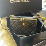 The image showcases the Chanel 23S Small Vanity Case in timeless black with luxurious gold hardware, featuring the iconic interlocking CC logo. This elegant piece is part of Chanel’s 2023 Cruise collection and reflects the house’s dedication to craftsmanship, exclusivity, and sophisticated design. Presented in its original box and packaging, this vanity case is not just a handbag but a collector’s item, ideal for those who appreciate refined fashion with a functional edge.