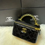 The Chanel Mini Vanity Case is a sophisticated and compact handbag, merging the elegance of Chanel’s heritage with modern utility. As the smallest offering among Chanel’s classic silhouettes, this mini case features the brand’s iconic quilted exterior, interlocking CC logo, and a chic top handle—exuding timeless Parisian charm. Its structure mirrors that of a traditional vanity case but in a downsized form, perfect for carrying essentials like cards, keys, and a lipstick.