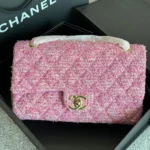 The featured handbag is a luxurious Chanel Mini Classic Flap Bag, possibly from the Chanel 24S collection, crafted in pink quilted wool tweed with navy and white accents. This piece showcases the iconic rectangular flap silhouette, gold-tone hardware, and the signature interlocking CC logo clasp. With its elegant combination of tweed texture and timeless design, the bag captures Chanel’s heritage of classic femininity and modern sophistication.
