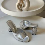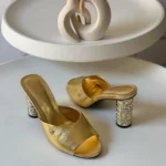 - Low block heel with elegant pearl or crystal embellishments