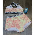 Step into summer with the elegant Christian Dior two-piece swimsuit, a sophisticated bikini set designed for fashion-forward swimwear lovers. This luxurious set features a bralette-style top and matching bottoms, both detailed with Christian Dior branding on the elastic bands, ensuring a chic and recognizable look that highlights the house’s iconic style.
