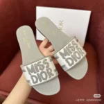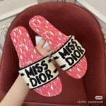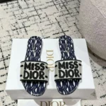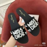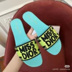 Make a bold and stylish statement with the Dior Dway Slides, featuring the eye-catching “Miss Dior” graffiti signature across a vibrant yellow strap. These designer slides fuse street-style edge with couture elegance, crafted with meticulous attention to detail. The wide fabric upper is adorned with black “MISS DIOR” lettering, while the insole showcases the iconic “Christian Dior” logo—a tribute to the legendary French designer and founder of the house of Dior.