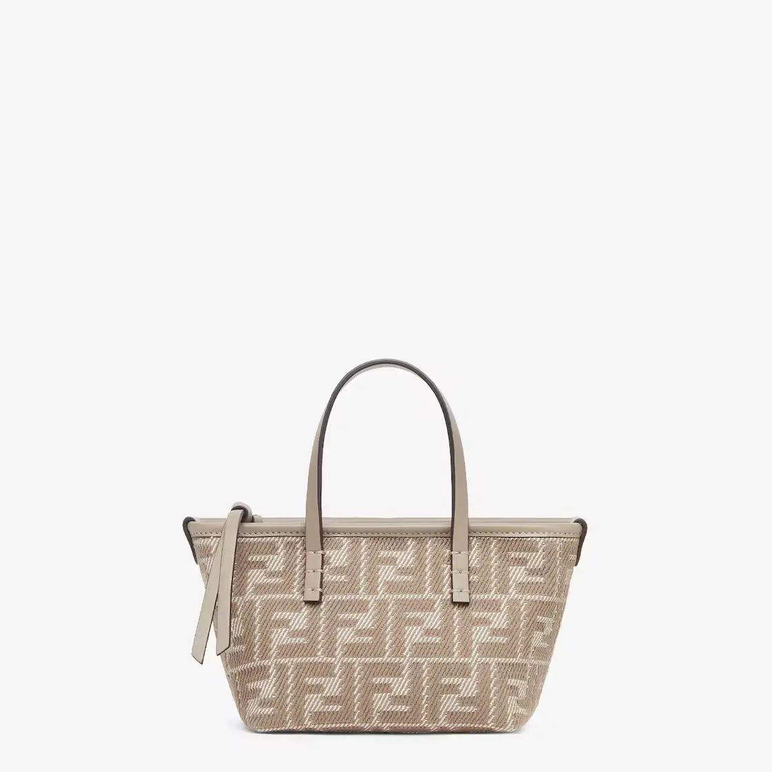 Compact and effortlessly stylish, the Fendi Mini Roll Bag in FF jacquard fabric brings a modern twist to a classic design. Crafted in Italy, this mini shopper features the iconic brown FF monogram woven into textured jacquard, paired with sleek leather trim and minimal gold-tone accents. Its curved silhouette and structured base give it a unique, architectural look that stands out in any setting.