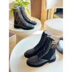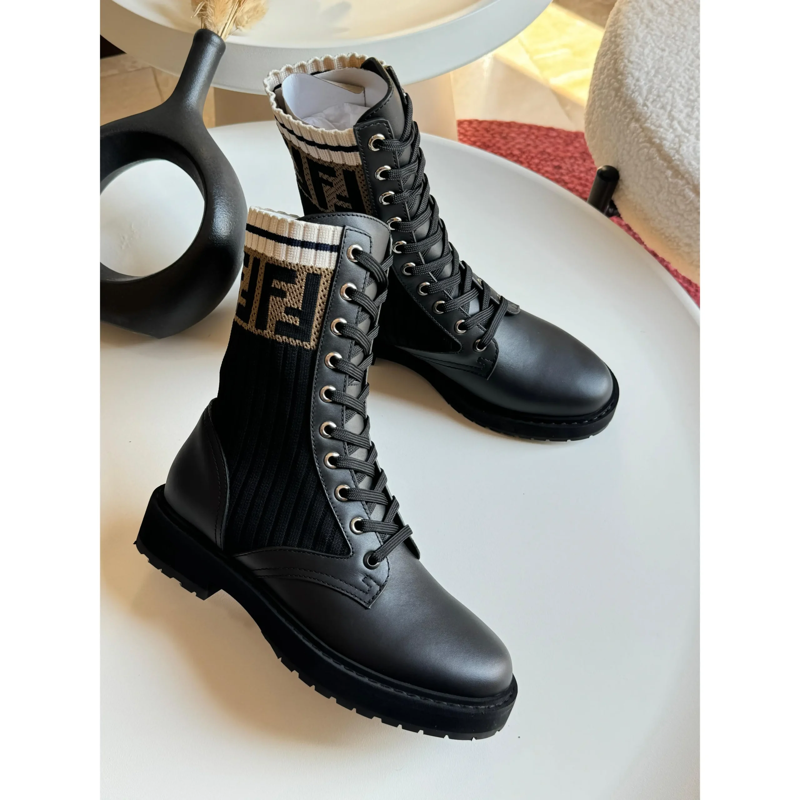 Fendi Rockoko Combat Boots – Black Leather with Logo Ribbed Knit Shaft & Non-Slip Rubber Sole in Dubai UAE