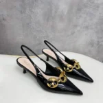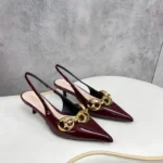 Make a bold and elegant statement with the Gucci Women’s Square Toe High Heel Pumps. Crafted from glossy dark red patent leather, these sophisticated heels feature a sleek pointed square toe, a refined slingback strap for added support, and a striking gold-toned chain detail across the front—offering a signature touch of Gucci glamour.