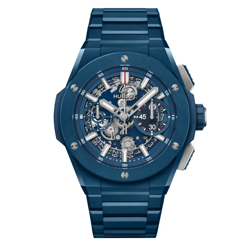 The Hublot Big Bang Integral Blue Ceramic 42mm – 451.EX.5123.EX is a striking blend of contemporary design and high-end craftsmanship, showcasing Hublot’s commitment to innovation. The watch features a bold 42mm case made from blue ceramic, a lightweight and durable material that is also highly resistant to scratches. The case is paired with an integrated bracelet, which seamlessly connects to the case, giving the watch a fluid, continuous design that emphasizes its modern and sporty aesthetic. The blue ceramic not only adds a touch of vibrancy but also brings a sense of sophistication and luxury to the timepiece.