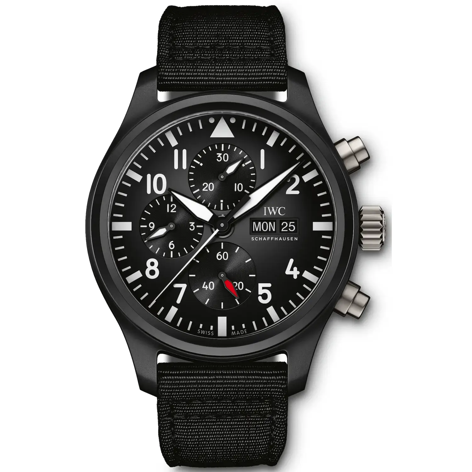 The IWC Pilot’s Chronograph Top Gun IW389101 is a high-performance timepiece designed for aviation professionals and watch enthusiasts who demand precision and durability. Encased in a 44.5mm black ceramic case, this chronograph is exceptionally lightweight, scratch-resistant, and built to withstand extreme conditions. The stealthy matte black dial features bold white Arabic numerals, luminescent hands, and a red-accented running seconds subdial at 6 o’clock, ensuring superior readability. Powered by the IWC Caliber 69380 automatic movement, this watch offers a 46-hour power reserve and a robust column-wheel chronograph function for precise timekeeping. A soft-iron inner case enhances magnetic resistance, while the 100m water resistance ensures reliability in various environments. The watch is paired with a black textile strap, adding to its rugged military aesthetic.