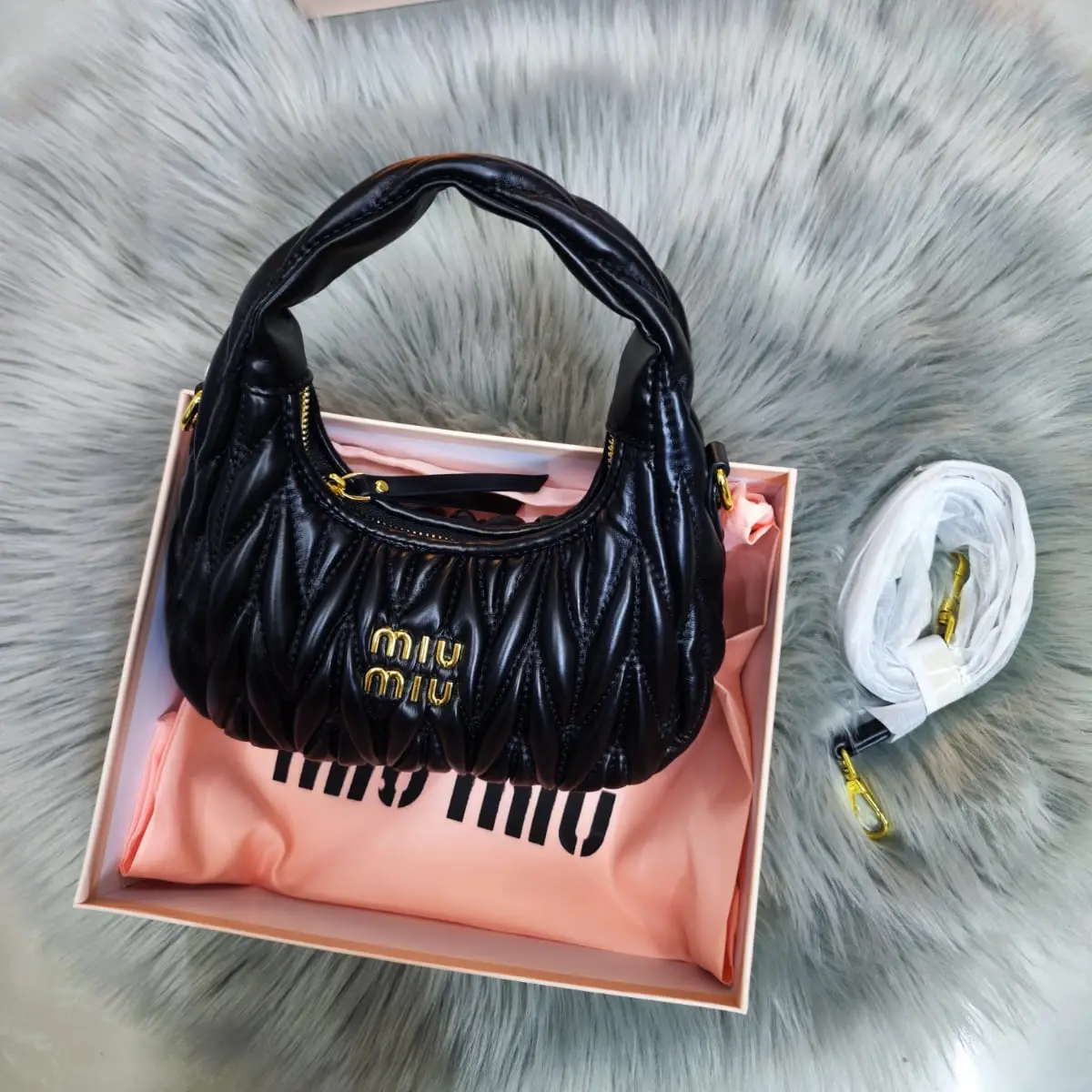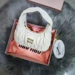 Add a statement of modern femininity to your wardrobe with the Miu Miu Wander Matelassé Small Hobo Bag, a fashion-forward blend of edgy design and timeless elegance. Crafted from the brand’s signature matelassé nappa leather, this small hobo bag features a soft, pillowy texture that’s as luxurious as it is eye-catching. Its compact silhouette, curved structure, and top handle design bring a bold yet feminine charm, while the metal Miu Miu logo adds that unmistakable designer finish.