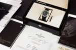 The Patek Philippe 5164R Aquanaut in rose silver with a black embossed dial is a dynamic and sophisticated timepiece that effortlessly blends luxury with rugged functionality. The 40.8mm case, crafted from silver, presents a striking contrast to the bold, textured black dial. The dial’s signature embossed pattern adds depth and enhances the watch’s overall visual appeal. Featuring a dual-time zone complication, the 5164R is a versatile companion for global travelers, with a day/night indicator for both time zones. The date window at 6 o’clock and the sapphire crystal case back reveal the intricate details of the watch’s movement, making this a functional and beautiful piece.