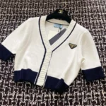 Add a touch of preppy luxury to your wardrobe with this Prada women’s varsity-style cropped cardigan. Crafted from soft, high-quality knit fabric, this sweater features fine embroidery and a tailored fit that balances classic school-girl charm with modern elegance. The cropped cut and varsity detailing give it a youthful, fashion-forward vibe, perfect for layering over casual or semi-formal outfits.