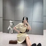 Crafted from high-quality, breathable fabric, the dress showcases a short-sleeve design and a crisp collared neckline, bringing a polished, structured appeal. A matching attached belt cinches at the waist to enhance the figure, while initial patching or a subtle brand logo detail adds a fashionable, designer-inspired edge. The soft light white or off-white hue gives the dress a clean, minimalist feel—easy to pair with sandals, loafers, or heels depending on the setting.
