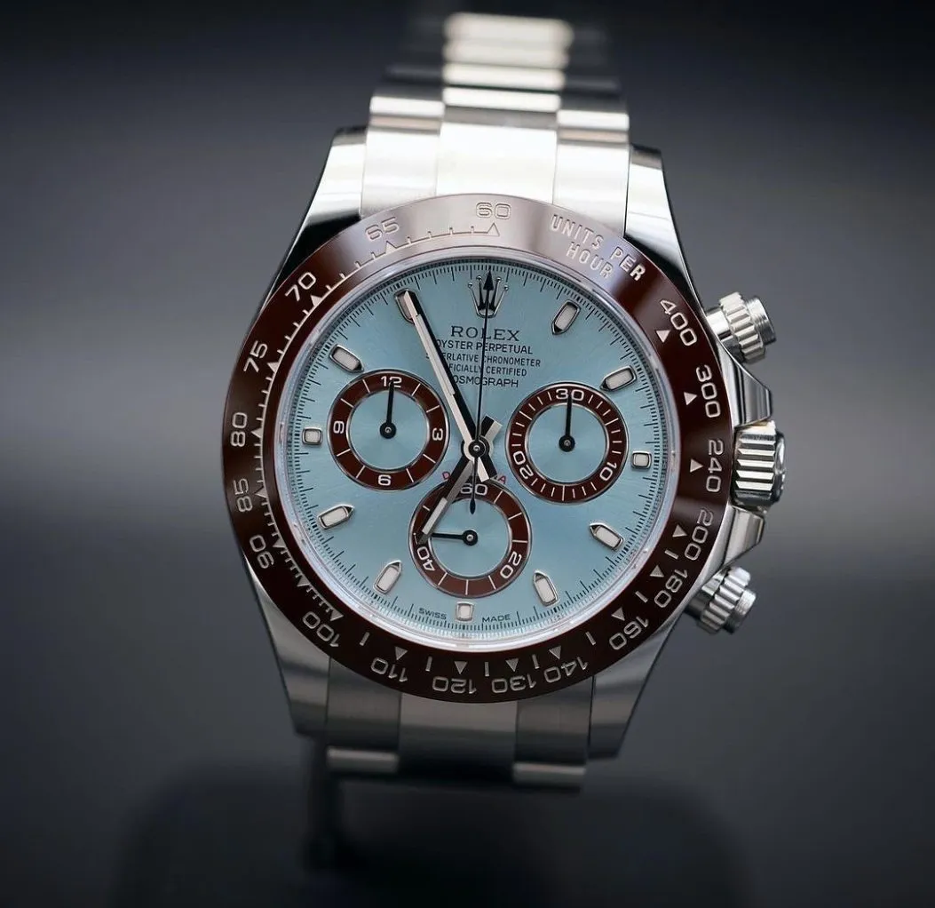 The Rolex 116506 Cosmograph Daytona is a prestigious timepiece that stands out as the first Daytona crafted in platinum, making it one of the most exclusive models in the collection. This luxurious 40mm watch features a striking ice blue dial, a signature of Rolex’s platinum models, complemented by dark chestnut brown sub-dials for a sophisticated contrast. The matching chestnut brown Cerachrom ceramic bezel enhances durability, offering exceptional resistance to scratches and fading. Powered by the in-house Caliber 4130 movement, this Daytona ensures superior chronograph performance, a 72-hour power reserve, and Rolex’s legendary precision. As a tribute to its racing heritage, the engraved tachymeter scale on the bezel allows for precise speed measurements, making it an essential tool for motorsport enthusiasts.