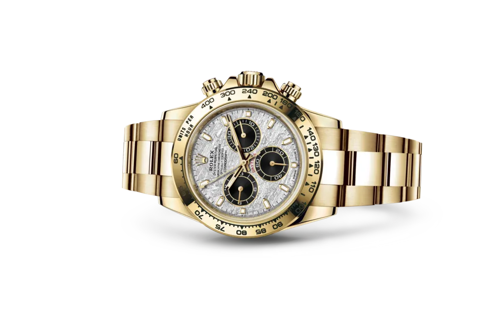 The Rolex 116508 Daytona Meteorite is a remarkable timepiece that combines extraordinary design with high-performance engineering. Crafted from 18k yellow gold, the 40mm Oyster case exudes luxury while maintaining durability and strength. The showstopper of this model is the genuine meteorite dial, which showcases unique, naturally occurring crystalline patterns that make each piece truly one of a kind. The black sub-dials provide a striking contrast against the metallic shimmer of the meteorite, enhancing legibility while preserving the Daytona’s signature sporty aesthetic. Complementing the dial is a yellow gold tachymeter bezel, engraved with a scale for precise speed measurement, a nod to the watch’s motorsport heritage.