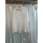 Indulge in luxurious comfort with the Valentino Satin Pajama Set, a refined lounge ensemble that blends elegance with ease. This two-piece set includes a long-sleeved, button-up shirt and matching wide-leg trousers, both crafted from smooth, glossy satin for a sleek, high-end look. The standout feature is the iconic Valentino “V” logo, tastefully displayed across both pieces, making this set unmistakably designer.